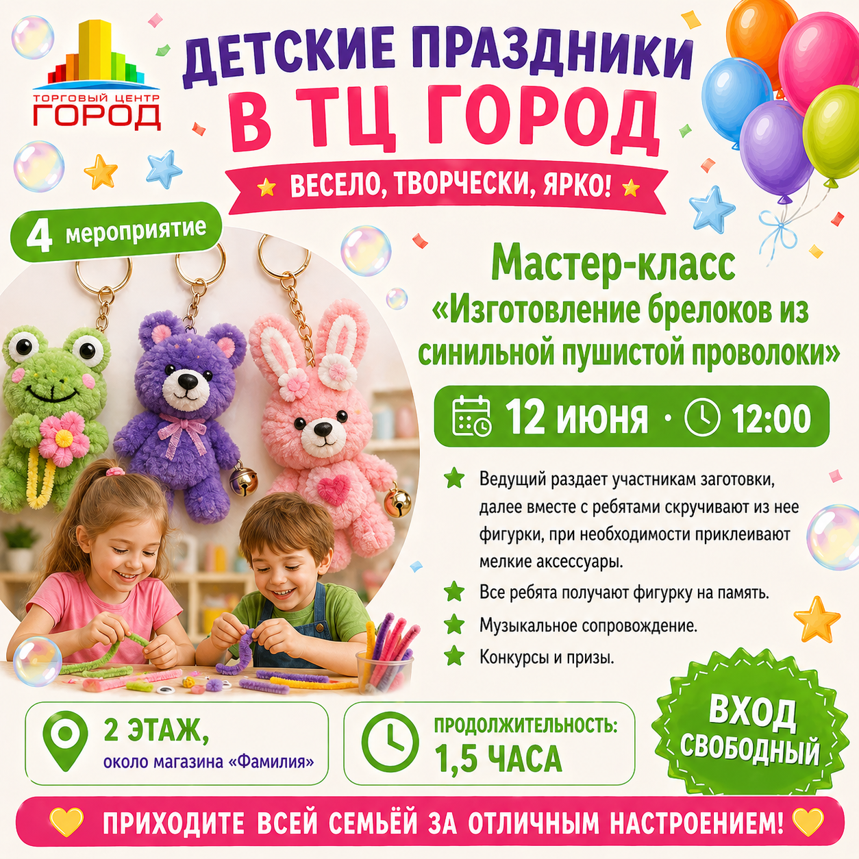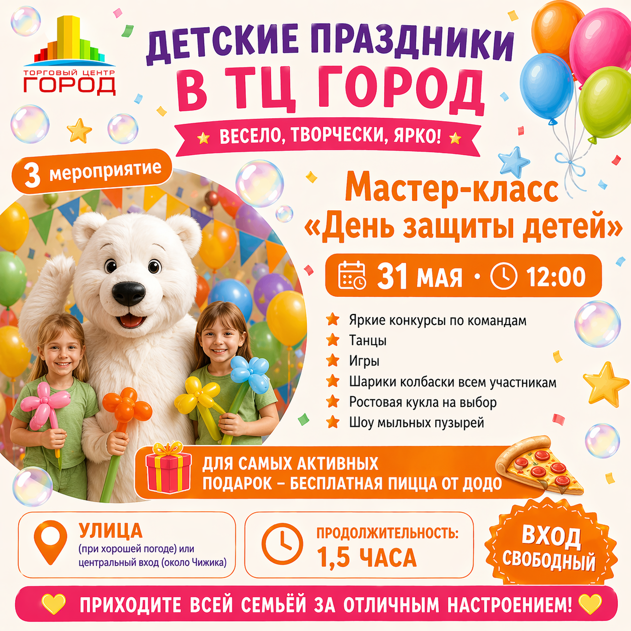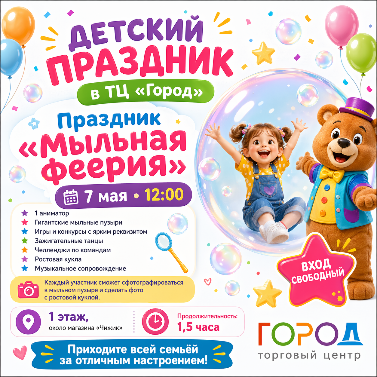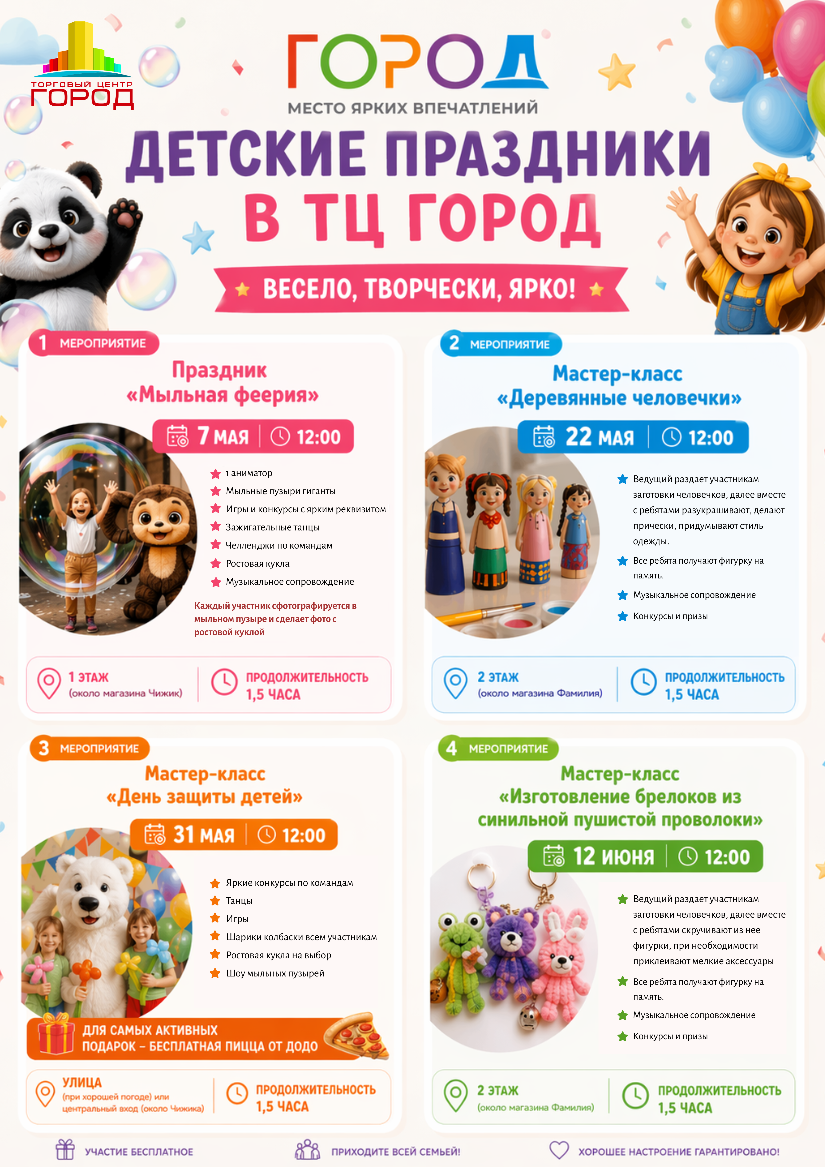 Весна и лето 2025 в ТЦ «Город» будут наполнены смехом, творчеством и незабываемыми эмоциями. Мы подготовили для детей настоящую программу праздников: от гигантских мыльных пузырей и ростовых кукол до увлекательных мастер-классов, где каждый ребёнок сможет создать свой собственный сувенир.