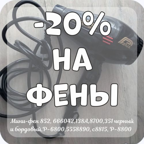 -20% на фены: Мини-фен 852, 666042,138А,8700,351 черный и бордовый,P-6800,5558890,с8815,Р-8800